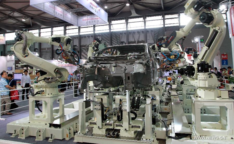 Visitors watch robots working during the China International Robot Show in east China's Shanghai, July 9, 2014. The three-day show kicked off on Wednesday, demonstrating latest achievements in the robot industry. (Xinhua/Pei Xin)
