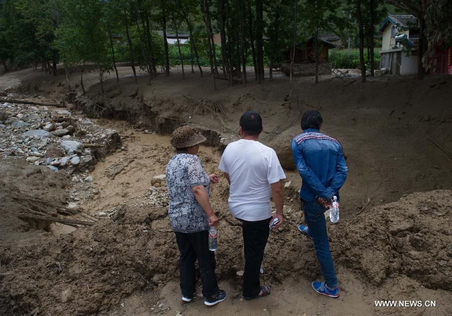 Villagers check the site after a rain-triggered landslide hit Gelan Village of Shangri-La County in Diqing Prefecture, southwest China's Yunnan Province, July 10, 2014. Two people went missing and three others injured in the landslide which occurred on early Thursday morning. (Xinhua/Luo Xiaoguang)