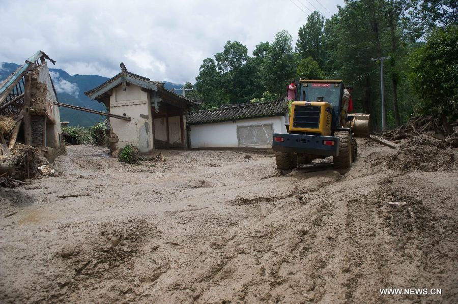 Rescuers clear the debris after a rain-triggered landslide hit Gelan Village of Shangri-La County in Diqing Prefecture, southwest China's Yunnan Province, July 10, 2014. Two people went missing and three others injured in the landslide which occurred on early Thursday morning. (Xinhua/Luo Xiaoguang)