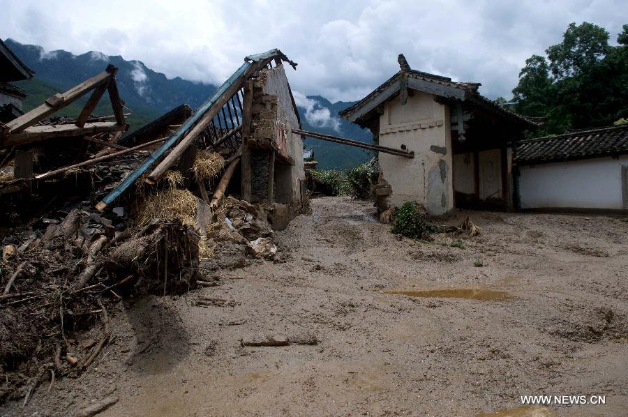 Photo taken on July 10, 2014 shows the site after a rain-triggered landslide hit Gelan Village of Shangri-La County in Diqing Prefecture, southwest China's Yunnan Province. Two people went missing and three others injured in the landslide which occurred on early Thursday morning. (Xinhua/Luo Xiaoguang)