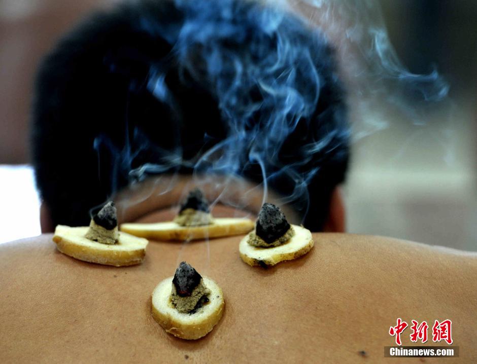 People receive the dog day moxibustion treatment in a hospital in Fuzhou on July 8, 2014. Dog day moxibustion originated in the Qin and Han dynasties. It is called the world's first preventive medicine. Chinese people receive the "dog day moxibustion" in summer in order to prevent some common diseases in winter. (Photo/CNS)