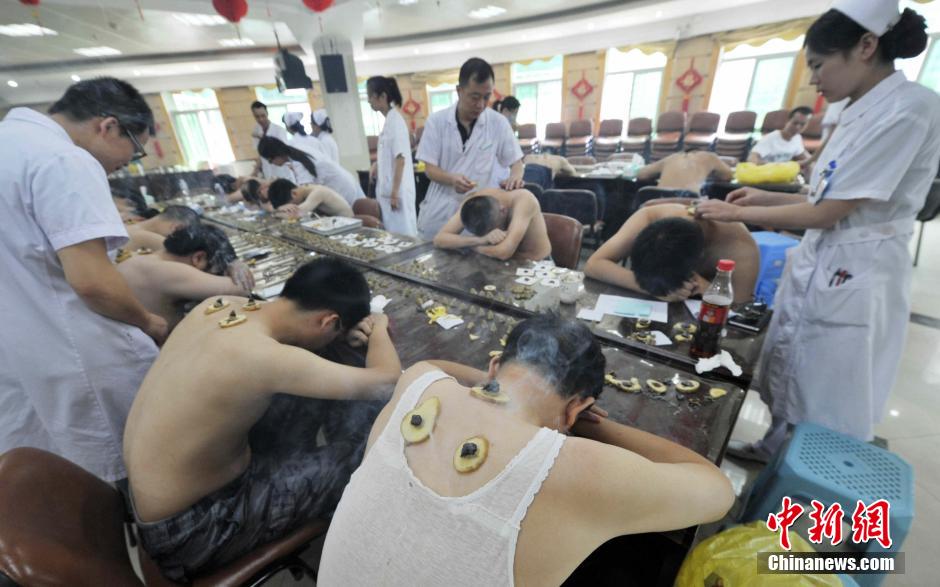 People receive the dog day moxibustion treatment in a hospital in Fuzhou on July 8, 2014. Dog day moxibustion originated in the Qin and Han dynasties. It is called the world's first preventive medicine. Chinese people receive the "dog day moxibustion" in summer in order to prevent some common diseases in winter. (Photo/CNS)