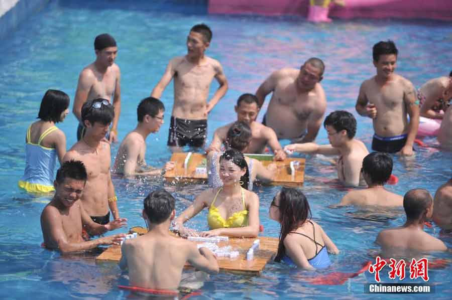 Citizens were spending hot days in water playing majhong in southwest China's Chongqing municipality. (China News Service/Chen Chao)