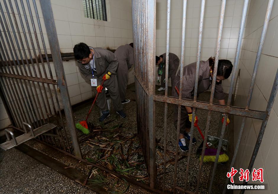 Twelve university students from Taiwan and Sichuan provinces arrive at Ya'an Bifengxia Breeding Base of the China Giant Panda Protection and Research Center, home town of the first Taiwan-born panda Yuan Zai on July 7, 2014. They cleaned the pandas' house, prepared milk and fed the giant pandas and recorded the rhythm of pandas' body movements. ( Chinanews.com/ Li Huajun)