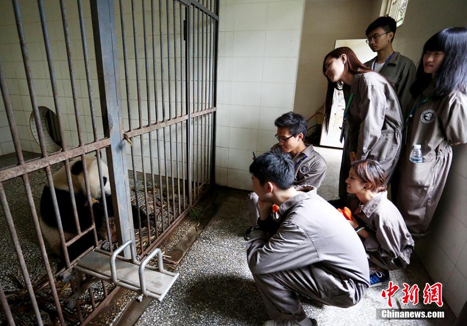 | Twelve university students from Taiwan and Sichuan provinces arrive at Ya'an Bifengxia Breeding Base of the China Giant Panda Protection and Research Center, home town of the first Taiwan-born panda Yuan Zai on July 7, 2014. They cleaned the pandas' house, prepared milk and fed the giant pandas and recorded the rhythm of pandas' body movements. ( Chinanews.com/ Li Huajun) |