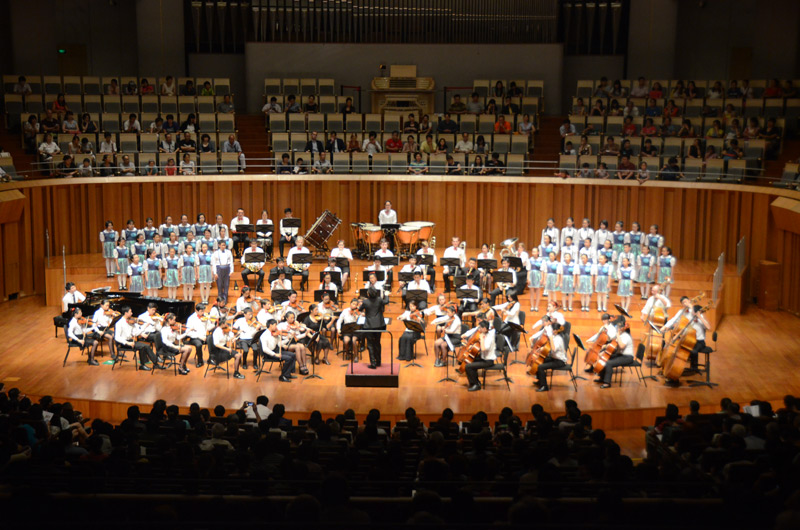 | The Shabanzhuang Primary School choir from Beijing's Chaoyang District participates in the grand finale Xin Jin Shan Symphonic Poem at the National Grand Theatre in Beijing, July 8, 2014. (People's Daily Online/Du Mingming) |