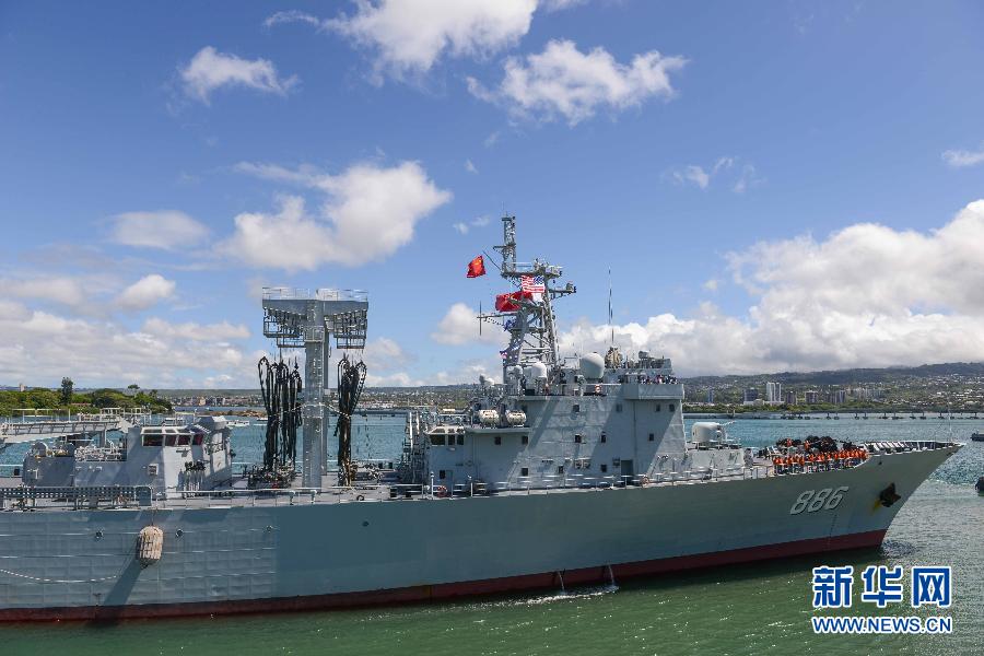 Photo taken on July 9, 2014 shows Chinese navy's missile frigate Yueyang leaves Pearl Harbor in Hawaii, the United States. The Chinese fleet participating in the Rim of the Pacific (RIMPAC) multinational naval exercises left Pearl Harbor for the exercise area on Wednesday. (Xinhua/Qin Haishi)