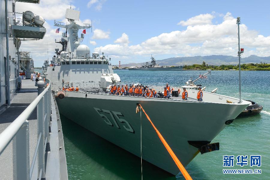 Photo taken on July 9, 2014 shows Chinese navy's missile frigate Yueyang leaves Pearl Harbor in Hawaii, the United States. The Chinese fleet participating in the Rim of the Pacific (RIMPAC) multinational naval exercises left Pearl Harbor for the exercise area on Wednesday. (Xinhua/Qin Haishi)