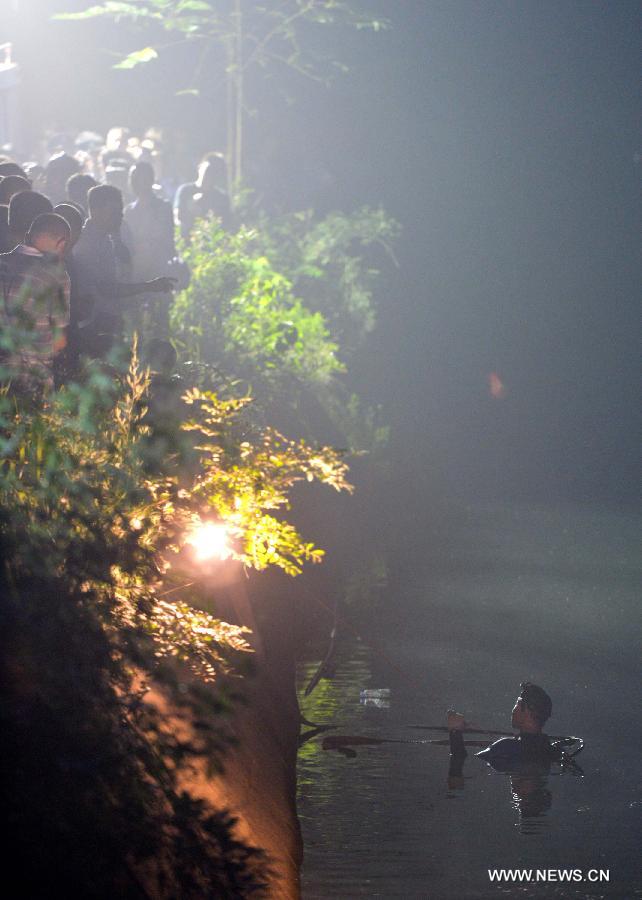 A diver searches for a kindergarten bus which fell into the pond at the mountainous Ganzi Village in the Yuelu District of Changsha, capital of central China's Hunan Province, July 11, 2014. All 11 people aboard, namely eight kindergarten children, two teachers and the driver, died after the minivan fell into the pond on Thursday afternoon. The bus was then carrying the children home from the Lelewang Kindergarten at Jinqiao Village in the city of Xiangtan, adjacent to Changsha. (Xinhua/Bai Yu)