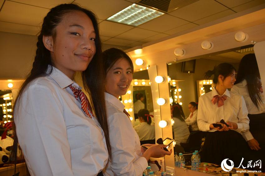 Members of the Australian New Goldberg Orchestra pose for photo in the dressing room of the National Grand Theatre in Beijing, July 8, 2014. (People's Daily Online/Du Mingming)