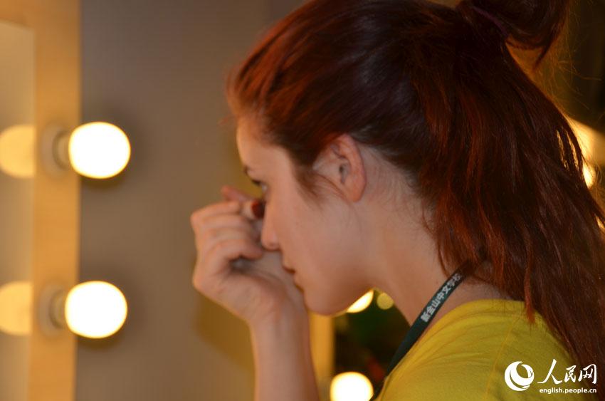 A member of the Australian New Goldberg Orchestra puts on makeup in the dressing room of the National Grand Theatre in Beijing, July 8, 2014. (People's Daily Online/Du Mingming)