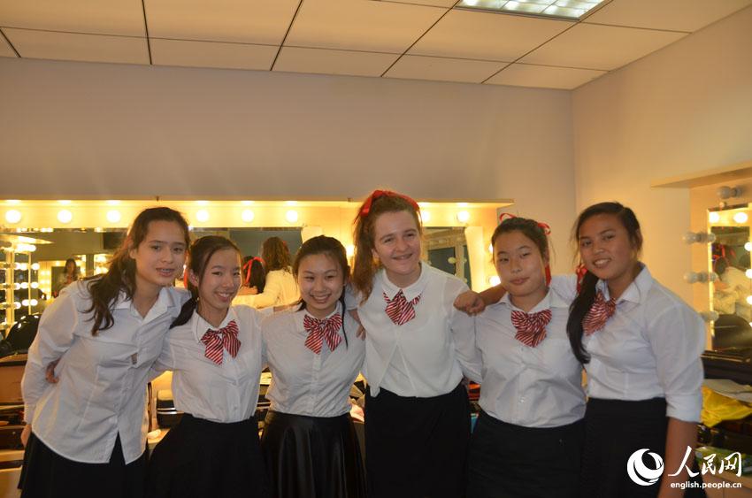 Members of the Australian New Goldberg Orchestra pose for photo in the dressing room of the National Grand Theatre in Beijing, July 8, 2014. (People's Daily Online/Du Mingming)