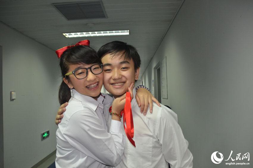 Annie Zhang (left) poses for a photo with her brother in the backstage of the National Grand Theatre in Beijing, July 8, 2014. Both of them are members of the orchestra. (People's Daily Online/Du Mingming)