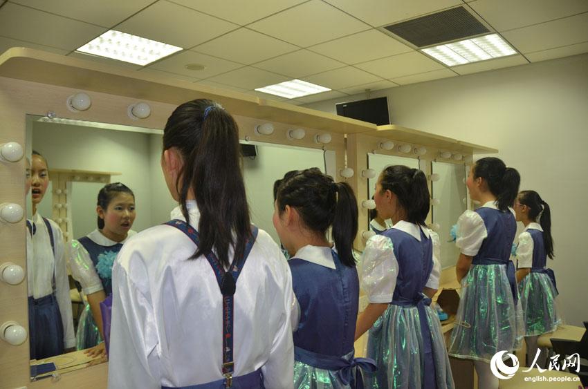 Pupils from Shabanzhuang Primary School choir, Beijing's Chaoyang District, practice singing in front of mirrors in the dressing room of the National Grand Theatre in Beijing, July 8, 2014. (People's Daily Online/Du Mingming)