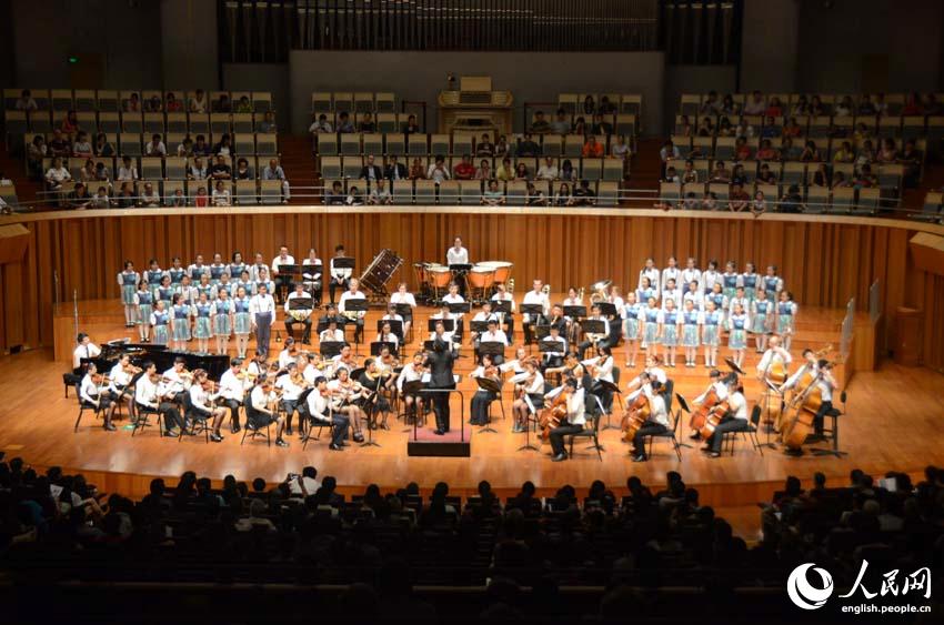 | The Shabanzhuang Primary School choir from Beijing's Chaoyang District participates in the grand finale Xin Jin Shan Symphonic Poem at the National Grand Theatre in Beijing, July 8, 2014. (People's Daily Online/Du Mingming) |