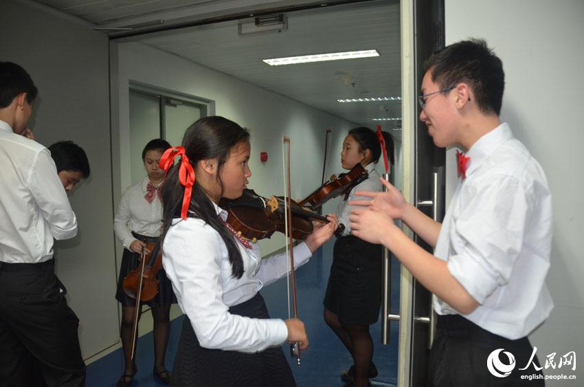 Members of the Australian New Goldberg Orchestra practice in the backstage of the National Grand Theatre in Beijing, July 8, 2014. (People's Daily Online/Du Mingming)