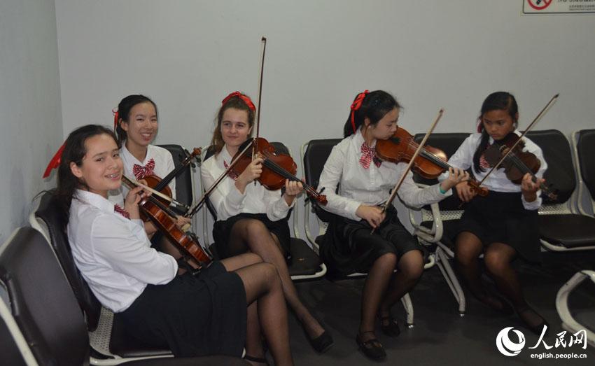 Members of the Australian New Goldberg Orchestra practice in the backstage of the National Grand Theatre in Beijing, July 8, 2014. (People's Daily Online/Du Mingming)