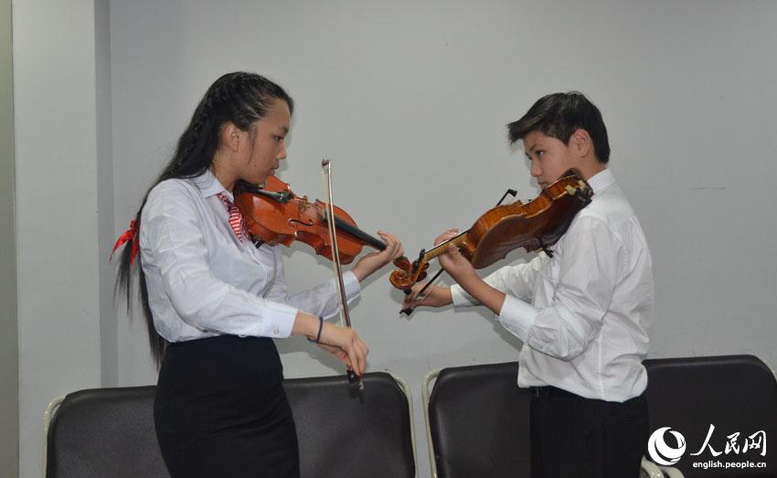 Members of the Australian New Goldberg Orchestra practice in the backstage of the National Grand Theatre in Beijing, July 8, 2014. (People's Daily Online/Du Mingming)