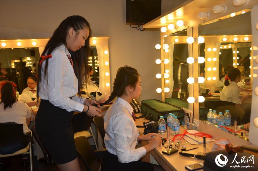A member of the Australian New Goldberg Orchestra helps another member style hair in the dressing room of the National Grand Theatre in Beijing, July 8, 2014. (People's Daily Online/Du Mingming)