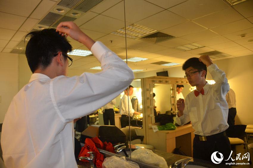 A member of the Australian New Goldberg Orchestra styles hair in the dressing room of the National Grand Theatre in Beijing, July 8, 2014. (People's Daily Online/Du Mingming)