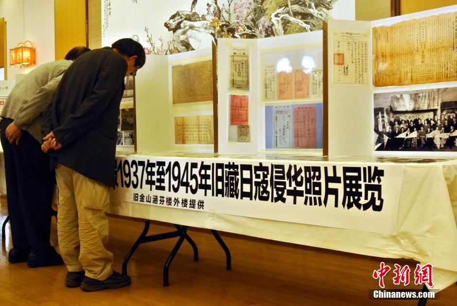 The Flying Tiger Historical Organization and the Global Alliance for Preserving the History of WW II in Asia present the photos of Flying Tiger Heritage Park in Guilin in San Francisco on July 7, 2014. Yuan Nansheng(first from left), China’s Consul General in San Francisco, held an exhibition and displayed more than 200 relics and documents related to the anti-Japanese war provided by the Chinese-American Association of Collection at the Consulate General’s residence.(Chinanews.com/ Liu Dan)