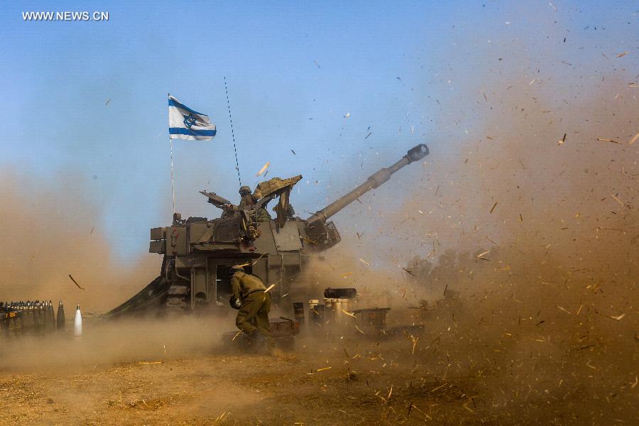 Israeli soldiers on a 155mm M109 Dores self-propelled howitzer fire a shell towards Gaza at a position in Southern Israel near the border with Gaza, on the fifth day of Operation Protective Edge, on July 12, 2014. Israel has no intention to halt the air strikes on Gaza in the coming days, Israeli Defense Minister Moshe Ya'alon told Army Radio on Saturday, as international pressure to negotiate a ceasefire deal in the conflict are gathering pace. The Palestinian health ministry said that since the beginning of the Israeli offensive on the Gaza Strip early on Tuesday, 127 Palestinians have been killed and 924 others wounded. And at the same time, Gaza militants fired about 690 rockets and mortars towards Israel. (Xinhua/JINI)