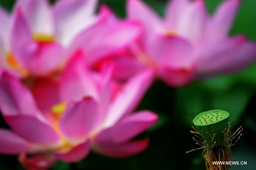 A seedpod is seen beside lotus flowers at the Lotus Park in Luoyang, central China's Henan Province, July 12, 2014. (Xinhua/Wang Song)