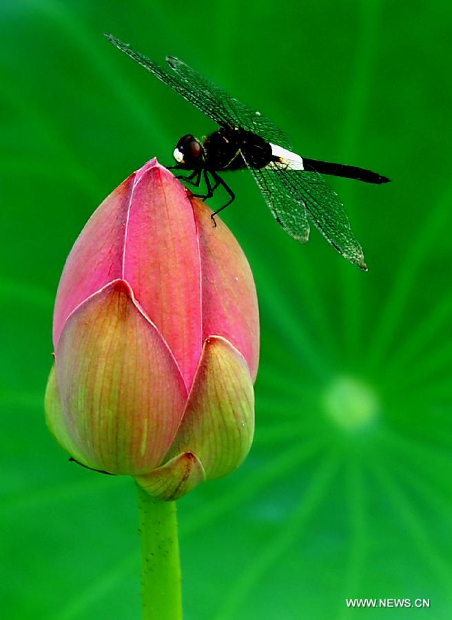 A dragonfly stays on a lotus bud at the Lotus Park in Luoyang, central China's Henan Province, July 12, 2014. (Xinhua/Wang Song)