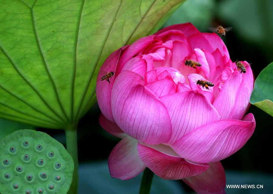 Bees collect honey on a lotus flower at the Lotus Park in Luoyang, central China's Henan Province, July 12, 2014. (Xinhua/Wang Song)