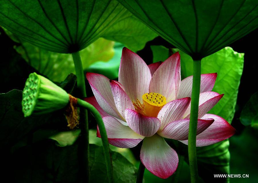 A lotus flower is in full bloom at the Lotus Park in Luoyang, central China's Henan Province, July 12, 2014. (Xinhua/Wang Song)