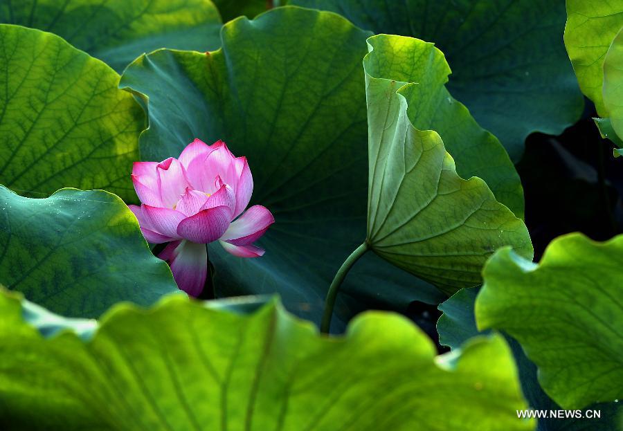 A lotus flower is in full bloom at the Lotus Park in Luoyang, central China's Henan Province, July 13, 2014. (Xinhua/Wang Song)