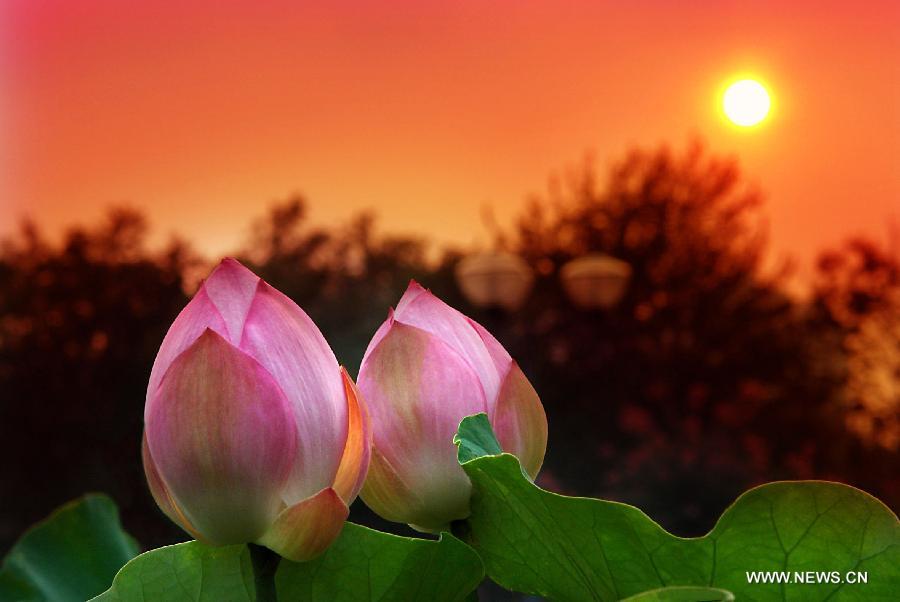 Photo taken on July 12, 2014 shows two lotus buds in the sunset at the Lotus Park in Luoyang, central China's Henan Province. (Xinhua/Wang Song)