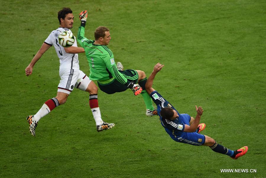 Germany's goalkeeper Manuel Neuer (C) vies with Argentina's Gonzalo Higuain (R) during the final match between Germany and Argentina of 2014 FIFA World Cup at the Estadio do Maracana Stadium in Rio de Janeiro, Brazil, on July 13, 2014.(Xinhua/Li Ga)