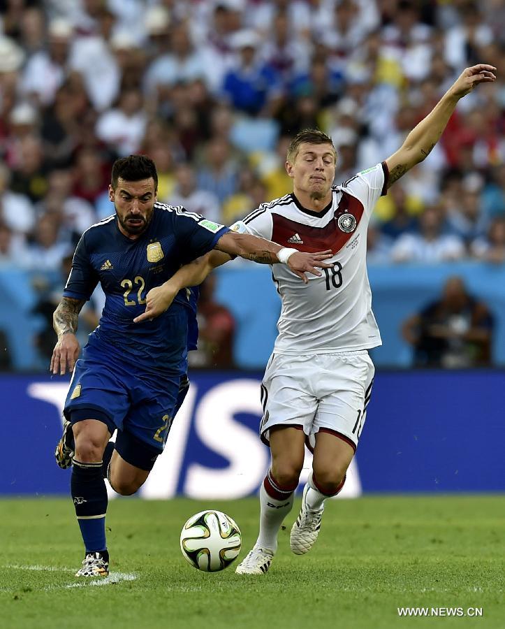 Germany's Toni Kroos (R) vies with Argentina's Ezequiel Lavezzi during the final match between Germany and Argentina of 2014 FIFA World Cup at the Estadio do Maracana Stadium in Rio de Janeiro, Brazil, on July 13, 2014. (Xinhua/Qi Heng)