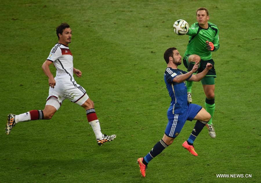 Germany's goalkeeper Manuel Neuer (R) vies with Argentina's Gonzalo Higuain (C) during the final match between Germany and Argentina of 2014 FIFA World Cup at the Estadio do Maracana Stadium in Rio de Janeiro, Brazil, on July 13, 2014.(Xinhua/Li Ga)