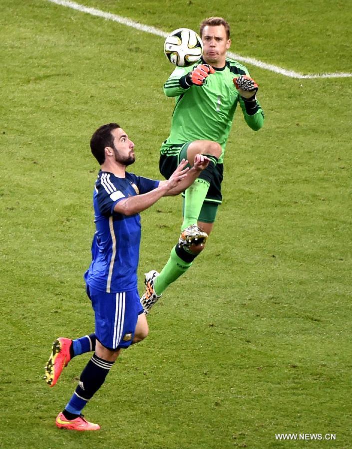 Germany's goalkeeper Manuel Neuer vies with Argentina's Gonzalo Higuain during the final match between Germany and Argentina of 2014 FIFA World Cup at the Estadio do Maracana Stadium in Rio de Janeiro, Brazil, on July 13, 2014. (Xinhua/Lui Siu Wai)