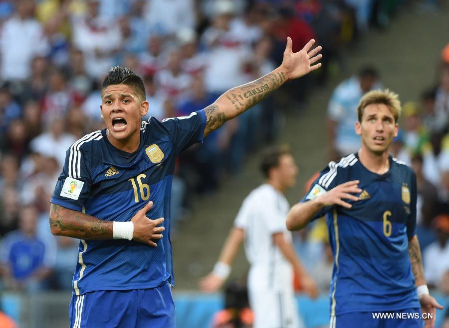 Argentina's Marcos Rojo (L) reacts during the final match between Germany and Argentina of 2014 FIFA World Cup at the Estadio do Maracana Stadium in Rio de Janeiro, Brazil, on July 13, 2014. (Xinhua/Liu Dawei)