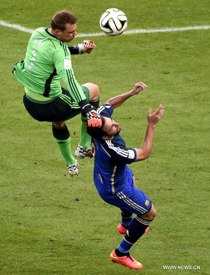 Germany's goalkeeper Manuel Neuer vies with Argentina's Gonzalo Higuain during the final match between Germany and Argentina of 2014 FIFA World Cup at the Estadio do Maracana Stadium in Rio de Janeiro, Brazil, on July 13, 2014. (Xinhua/Lui Siu Wai)