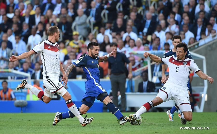 Argentina's Ezequiel Lavezzi (2nd L) vies with Germany's Mats Hummels (R) during the final match between Germany and Argentina of 2014 FIFA World Cup at the Estadio do Maracana Stadium in Rio de Janeiro, Brazil, on July 13, 2014. (Xinhua/Liu Dawei)