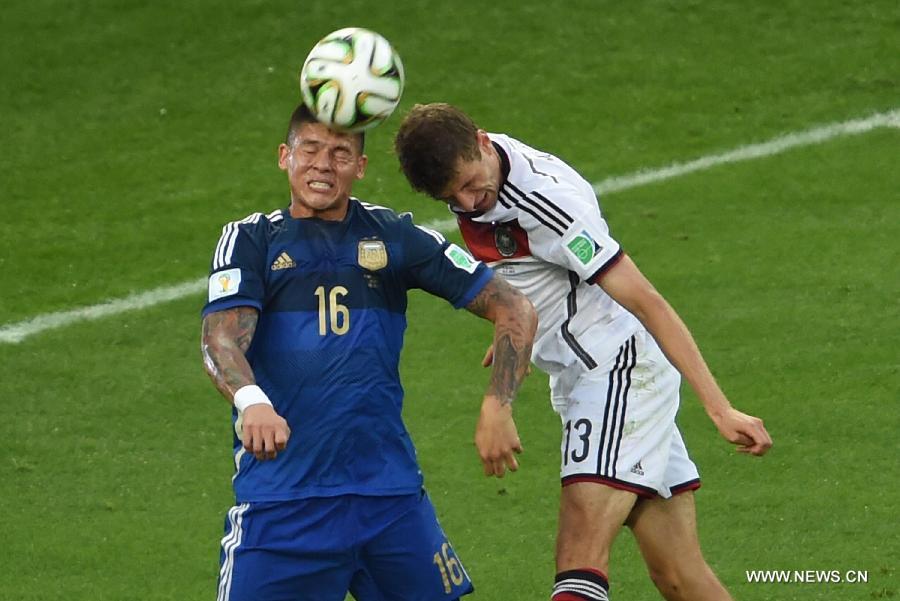 Germany's Thomas Muller competes for a header with Argentina's Marcos Rojo during the final match between Germany and Argentina of 2014 FIFA World Cup at the Estadio do Maracana Stadium in Rio de Janeiro, Brazil, on July 13, 2014. (Xinhua/Li Ga)