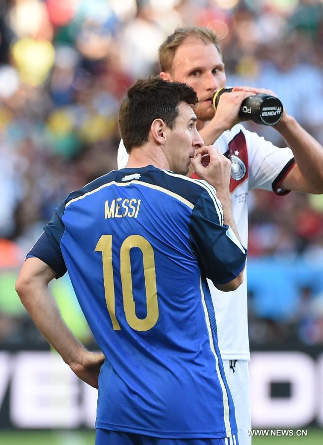 Argentina's Lionel Messi (front) reacts during the final match between Germany and Argentina of 2014 FIFA World Cup at the Estadio do Maracana Stadium in Rio de Janeiro, Brazil, on July 13, 2014. (Xinhua/Liu Dawei)