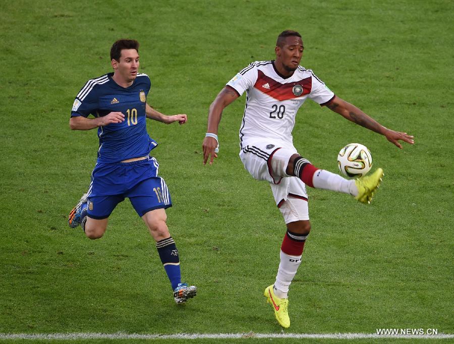 Germany's Lionel Messi vies with Argentina's Jerome Boateng during the final match between Germany and Argentina of 2014 FIFA World Cup at the Estadio do Maracana Stadium in Rio de Janeiro, Brazil, on July 13, 2014. (Xinhua/Li Ga)