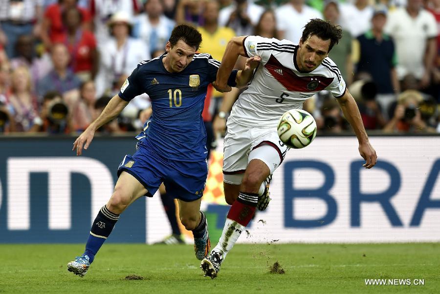 Germany's Mats Hummels (R) vies with Argentina's Lionel Messi during the final match between Germany and Argentina of 2014 FIFA World Cup at the Estadio do Maracana Stadium in Rio de Janeiro, Brazil, on July 13, 2014. (Xinhua/Qi Heng)