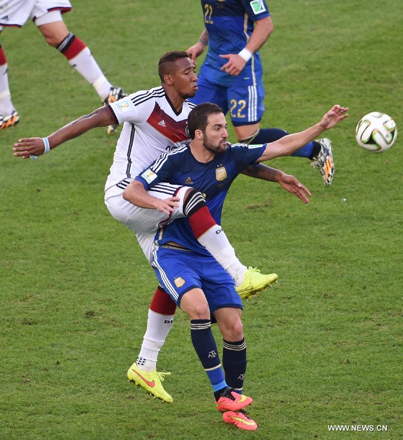 Germany's Jerome Boateng vies with Argentina's Gonzalo Higuain during the final match between Germany and Argentina of 2014 FIFA World Cup at the Estadio do Maracana Stadium in Rio de Janeiro, Brazil, on July 13, 2014. (Xinhua/Li Ga)