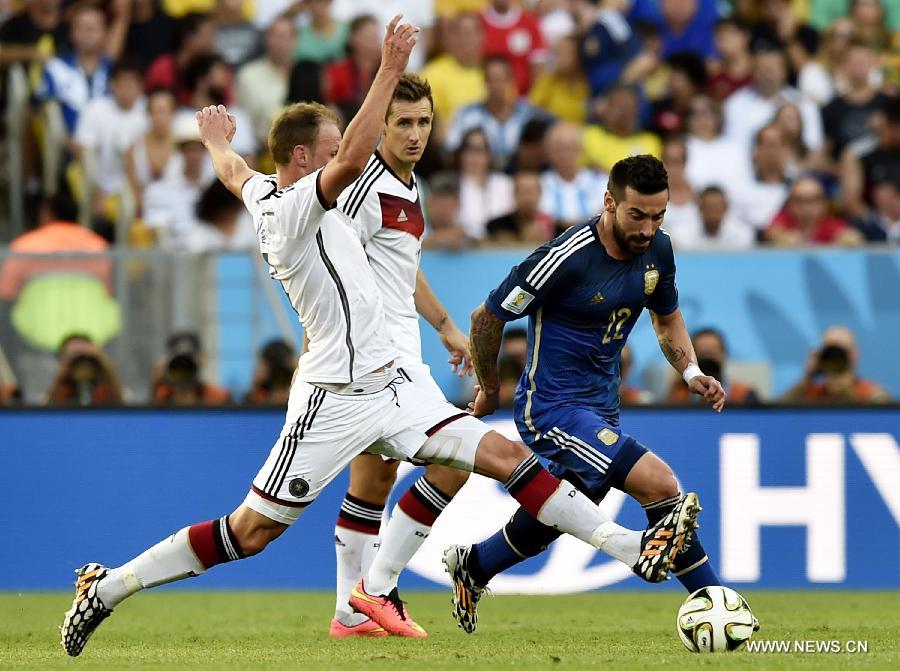 Argentina's Ezequiel Lavezzi (R) breaks through during the final match between Germany and Argentina of 2014 FIFA World Cup at the Estadio do Maracana Stadium in Rio de Janeiro, Brazil, on July 13, 2014. (Xinhua/Qi Heng)