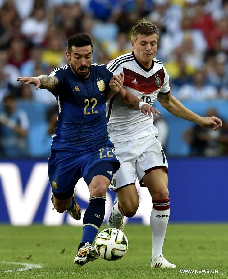 Germany's Toni Kroos (R) vies with Argentina's Ezequiel Lavezzi during the final match between Germany and Argentina of 2014 FIFA World Cup at the Estadio do Maracana Stadium in Rio de Janeiro, Brazil, on July 13, 2014. (Xinhua/Qi Heng)