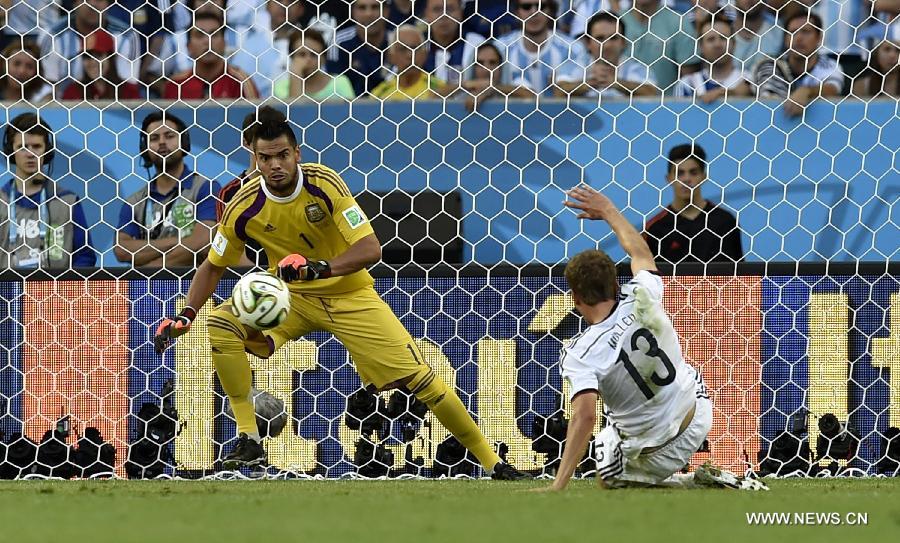 Argentina's goalkeeper Sergio Romero (L) saves a shot by Germany's Thomas Muller during the final match between Germany and Argentina of 2014 FIFA World Cup at the Estadio do Maracana Stadium in Rio de Janeiro, Brazil, on July 13, 2014. (Xinhua/Qi Heng)
