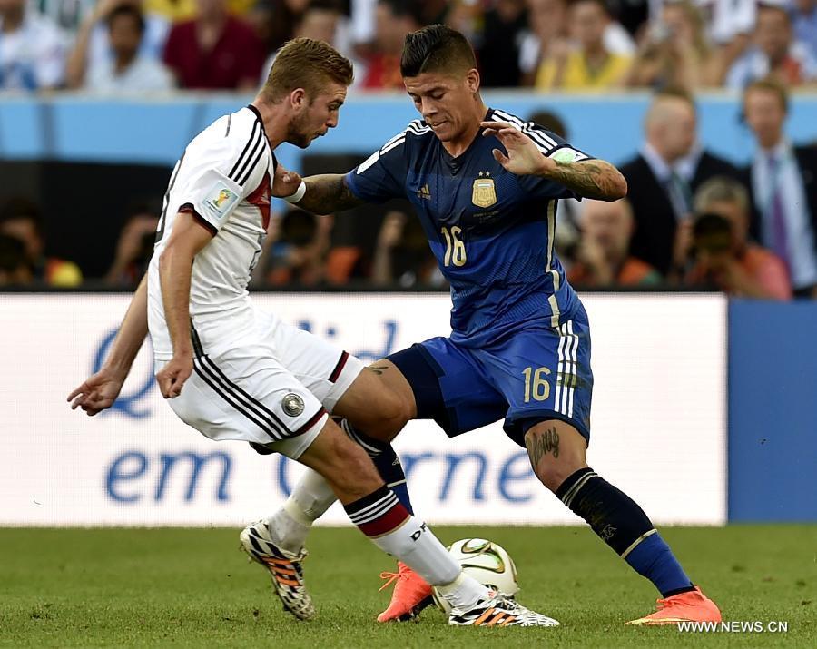 Germany's Toni Kroos (L) vies with Argentina's Marcos Rojo during the final match between Germany and Argentina of 2014 FIFA World Cup at the Estadio do Maracana Stadium in Rio de Janeiro, Brazil, on July 13, 2014. (Xinhua/Qi Heng)