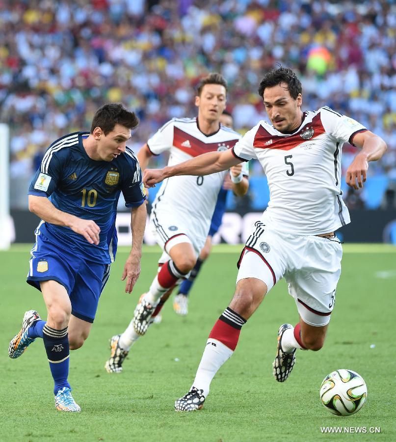Argentina's Lionel Messi (L) vies with Germany's Mats Hummels during the final match between Germany and Argentina of 2014 FIFA World Cup at the Estadio do Maracana Stadium in Rio de Janeiro, Brazil, on July 13, 2014. (Xinhua/Liu Dawei)