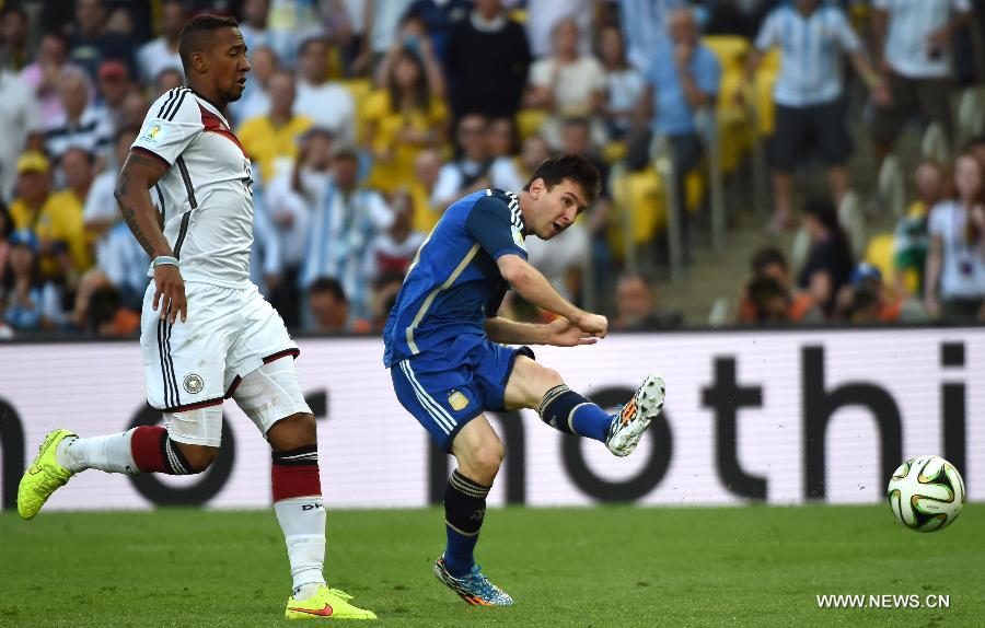 Argentina's Lionel Messi (R) makes a shot during the final match between Germany and Argentina of 2014 FIFA World Cup at the Estadio do Maracana Stadium in Rio de Janeiro, Brazil, on July 13, 2014. (Xinhua/Guo Yong)